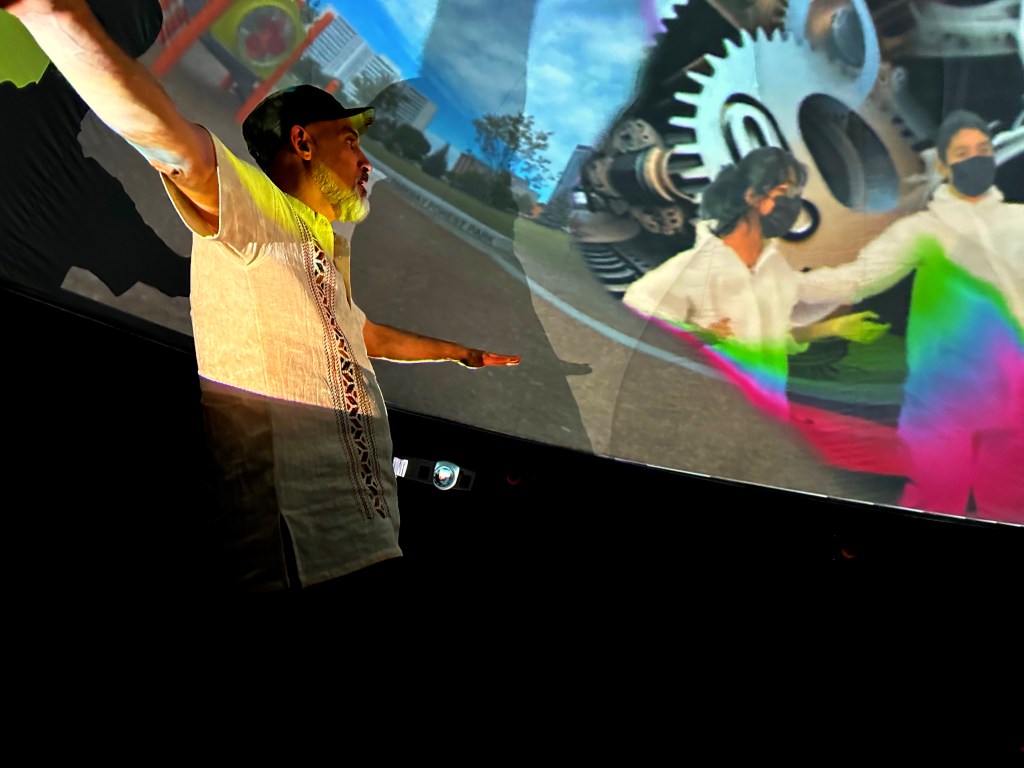 This community project introduces settler and Indigenous youth participants to immersive media production and world-building techniques, with which to create new narrative spaces. The images we created were combined with scenes of past, present and future imaginaries through two “time-machine” devices. The first is an immersive projection dome installation that weaves together an interactive time-travel experience, which spectators can control through their body movements, using Kinect sensors. The second is a geolocated augmented reality map.